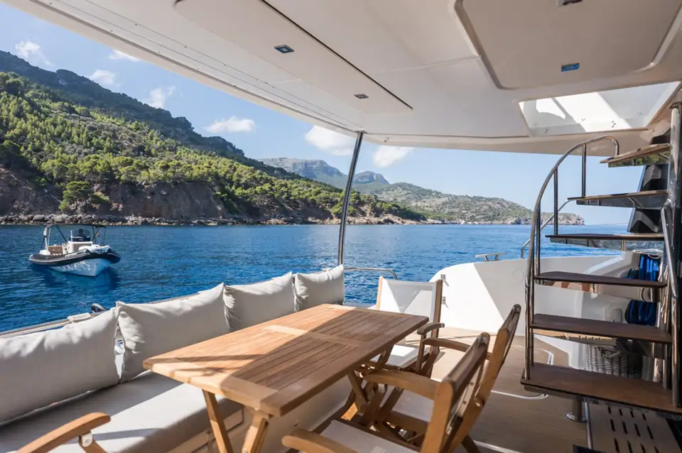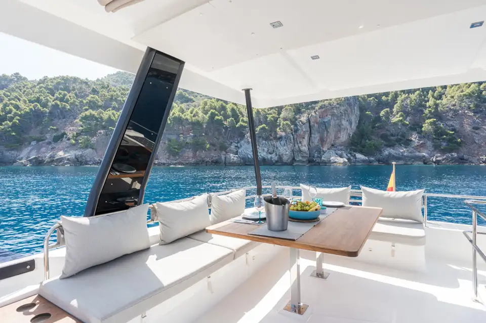 This Fountaine Pajot MY44 features three spacious bathrooms, wide lounging spaces, and a layout created to maximise comfort during your day at sea. Both the bow and the stern offer inviting sunbathing areas with plush cushions, while the shaded aft terrace is ideal for unwinding, enjoying a drink, or taking a break from the midday sun during your Mallorca boat rental experience.